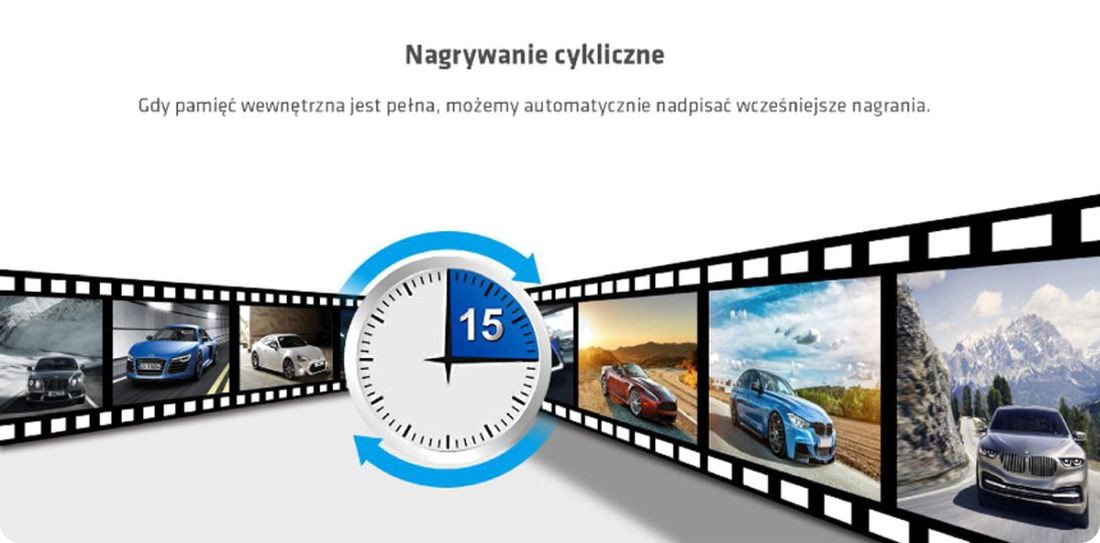 Jedna z głównych i najważniejszych cech rejestratorów samochodowych, włączenie tej funkcji pozwala ustawić długość nagrywanych pojedynczych materiałów wideo (2min, 3 min, 5 min). Wyłączenie tej opcji spowoduje rejestrację ciągłą materiału wideo (nie zaleca się), jednak należy pamiętać, że maksymalna długość filmujest ograniczona wielkością pliku 2GB wynikającą z ograniczeń formatu plików.