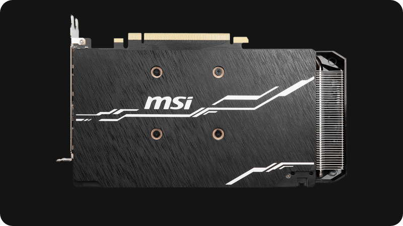 Tył karty MSI GeForce RTX 2060 został wzmocniony przez wytrzymałą płytę nośną. Jej zadaniem jest usztywnianie i wzmocnienie konstrukcji mechanicznej, oraz dodanie walorów estetycznych. Twój komputer zasługuje na solidne i eleganckie komponenty. Odsłonięcie części radiatora przez płytę nośną usprawnia przepływ powietrza i poprawia chłodzenie karty.