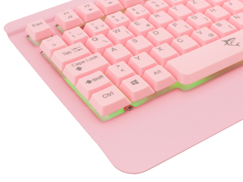 Klawiatura MIKASA zwraca uwagę swoją różową kolorystyką, której towarzyszy podświetlenie LED Rainbow oraz niewielką grubością korpusu z wyniesionymi ponad jego powierzchnię klawiszami. Klawiatura posiada przewód USB o długości 1,8 metra do wygodnego podłączeniu urządzenia do komputera.