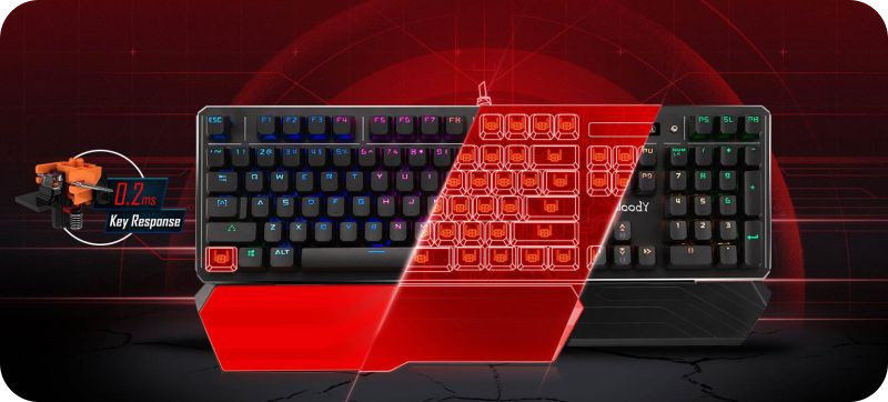 Najnowsza klawiatura mechaniczna Bloody B975 wykorzystuje innowacyjną technologię mechanicznych switch'y działających na podczerwień. Zapewnia to 30% szybszą reakcję urządzenia względem tradycyjnych metalowych czujników, co sprawia, że B975 jest najszybszą gamingową klawiaturą na świecie.