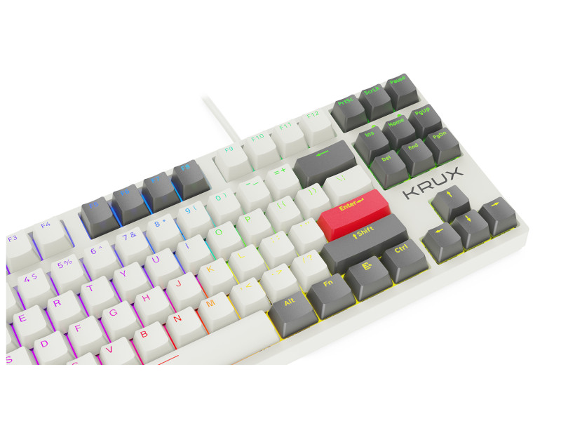 Krux Atax Pro RGB to klawiatura w rozmiarze TKL. Oznacza to brak bloku numerycznego po prawej stronie klawiatury. Jego wyeliminowanie przekładające się na mniejsze rozmiary klawiatury oznaczają, że prawa ręka zyskuje większy obszar do poruszania myszką podczas intensywnych rozgrywek. Dodatkowo ręce gracza mogą zostać bardziej zbliżone do siebie, pozwalając na bardziej naturalną pozycję siedzącą. Mniejszy rozmiar to również łatwiejszy transport, więc możesz cieszyć się bezkompromisowymi doznaniami gamingowymi również poza domem.