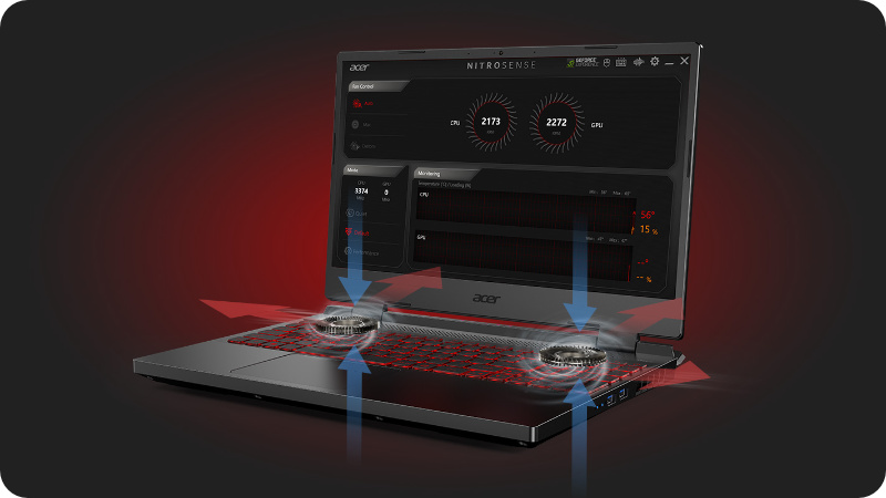 Nowo zaprojektowany, udoskonalony układ chłodzenia w Nitro 5 ma do zaoferowania sztuczki, z którymi skutecznie utrzymuje wydajność na wysokim poziomie przez długi czas. Dwa wentylatory wymuszają przepływ powietrza, zasysając je z góry i dołu urządzenia, następnie wydmuchując czterema otworami. W aplikacji NitroSense możesz dostosować pracę wentylatorów, aby nadać priorytet ciszy, absolutnej wydajności, lub znaleźć idealny dla Ciebie kompromis.
