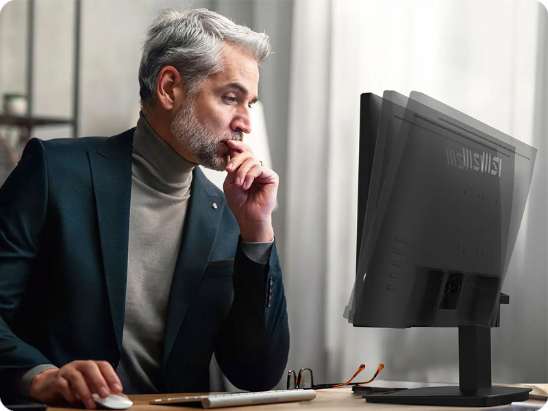 Technologia MSI EyesErgo dba o zdrowie oczu użytkownika. Funkcje Anti-Flicker i Less Blue Light, potwierdzone certyfikatem TÜV, minimalizują zmęczenie wzroku podczas długotrwałego użytkowania. Antyodblaskowa powłoka ekranu redukuje refleksy, poprawiając widoczność w różnych warunkach oświetleniowych. Monitor oferuje również oprogramowanie Eye-Q Check, które pomaga użytkownikom monitorować zmęczenie oczu i postawę.