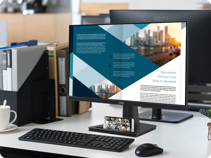 Monitor MSI PRO MP223 E2 został zaprojektowany z myślą o komforcie użytkownika. Dzięki ergonomicznemu wzornictwu i możliwości regulacji pozycji ekranu praca staje się wygodniejsza, nawet podczas długich godzin przed monitorem. Standard VESA pozwala na łatwe zamontowanie monitora na ramieniu, co zwiększa elastyczność aranżacji przestrzeni roboczej. Gniazdo na akcesoria, takie jak telefon, zapewnia porządek i łatwy dostęp do urządzeń.