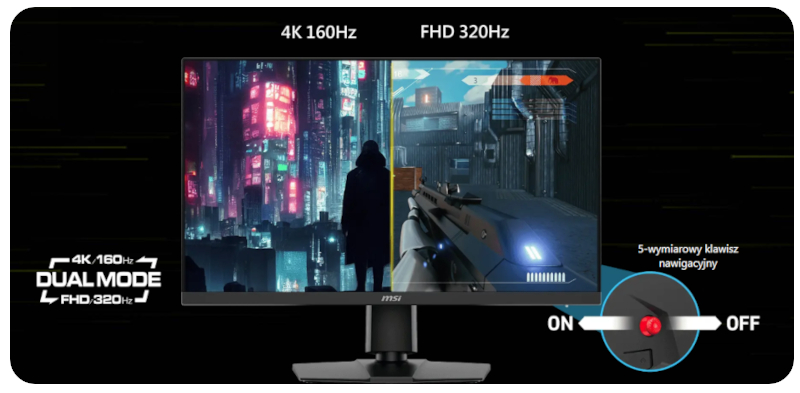 Funkcja Dual Mode umożliwia wybór rozdzielczości i częstotliwości odświeżania najlepiej dopasowanych do Twojej gry. Wybierz niższą rozdzielczość, ale wyższą częstotliwość odświeżania, aby grać w dynamiczną strzelankę pierwszoosobową, lub ciesz się ostrym obrazem 4K przy niższej częstotliwości odświeżania. Projekt jest zorientowany na użytkownika i kładzie nacisk na ergonomię i wygodę. Po prawej stronie ekranu znajduje się pięciowymiarowy klawisz nawigacyjny, który umożliwia łatwe przełączanie się między dwoma trybami, zapewniając tym samym bezproblemowe i przyjazne korzystanie z urządzenia.