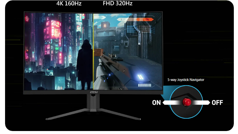 Tryb Dual Mode pozwala wybrać rozdzielczość i częstotliwość odświeżania, które najlepiej pasują do Twojej gry — wybierz wyższą częstotliwość odświeżania z niższą rozdzielczością dla szybkich gier FPS lub ciesz się ostrymi obrazami 4K z niższą częstotliwością odświeżania. Zaprojektowany z myślą o użytkowniku i ergonomicznej wygodzie, posiada 5-kierunkowy Joystick Navigator po prawej stronie ekranu i przycisk przełączania jednym kliknięciem, co ułatwia przełączanie ustawień trybu Dual Mode i zapewnia płynne, przyjazne dla użytkownika doświadczenie.