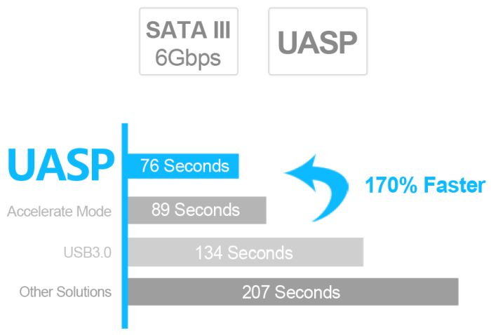 Adapter wyposażony jest w interfejs SATA III, który pozwala na maksymalne transfery 6Gbps. Zastosowanie najnowszego chipsetu Premium z funkcją UASP (USB SCSI Protocol) pozwala na osiąganie najwyższych rzeczywistych transferów: 2 razy szybszych niż te, które oferuje magistrala USB 3.0