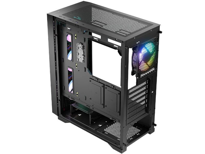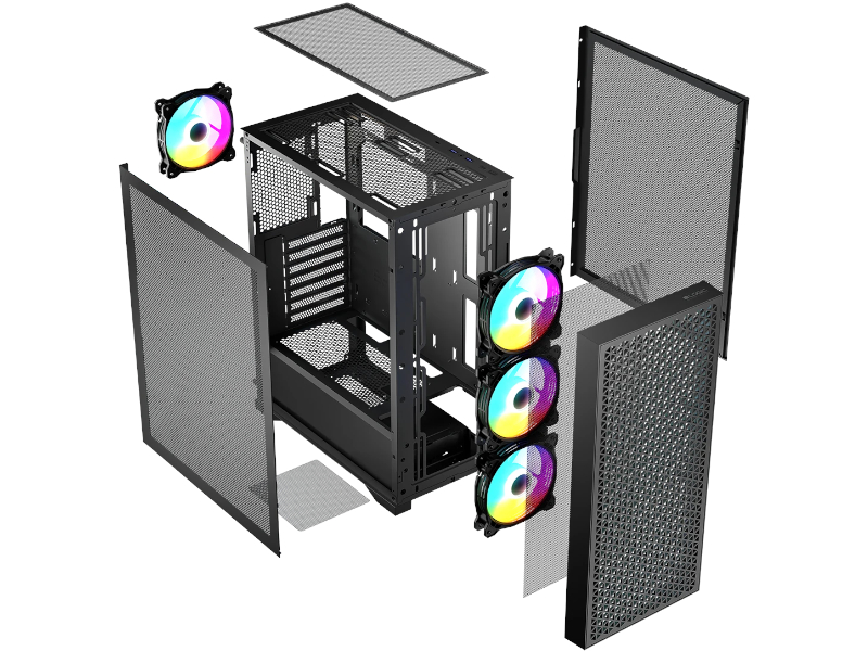 Wszystkie panele zostały zaprojektowane w sposób zapewniający jak najchłodniejszą pracę podzespołów. Oba panele boczne, panel frontowy i górny są perforowane, dzięki czemu ciepłe powietrze generowane przez pracujące wewnątrz komponenty ma gdzie „uciekać”. Całość uzupełniają - zamontowane w standardzie - cztery wentylatory ARGB z kontrolerem, dla jak najlepszego utrzymania niskich temperatur.