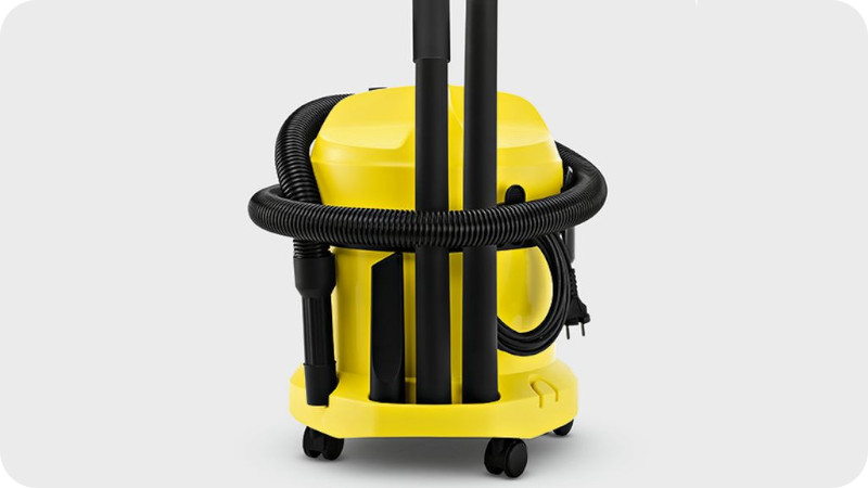 Akcesoria oraz wąż ssący i przewód zasilający dzięki praktycznym uchwytom można przechowywać na obudowie odkurzacza. Koniec z poplątanymi kablami lub zgubionymi końcówkami, teraz w końcu masz wszystko w jednym miejscu. Wygodna, rączka pozwala na łatwy transport urządzenia. Kompaktowe wymiary sprawiają że WD 2 nie zabiera miejsca podczas przechowywania.