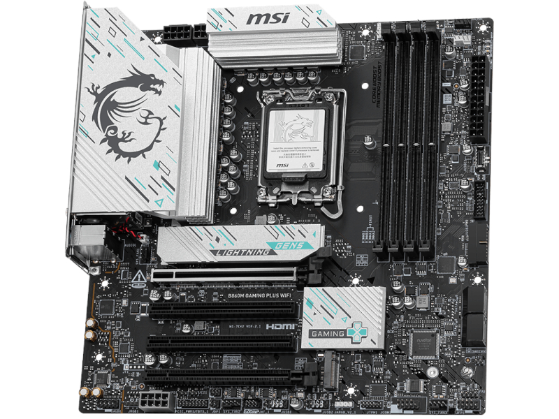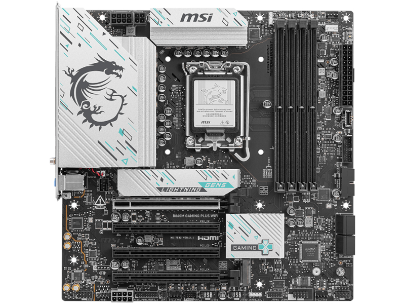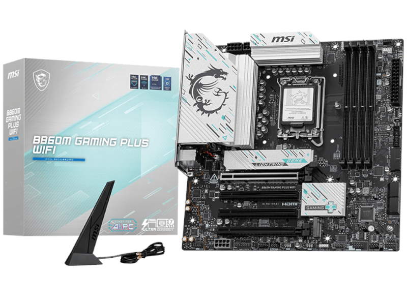 Płyty główne z serii B860M GAMING PLUS WIFI zostały stworzone z myślą o graczach poszukujących wszechstronnych wrażeń. Oferują one szerokie możliwości komunikacyjne, wszechstronne narzędzia i wysokiej klasy rozwiązania Wi-Fi. Dzięki portowi Thunderbolt 4, szybkiej, działającej z pełną prędkością sieci Wi-Fi 7, sieci LAN 5G, magistrali PCIe 5.0, dodatkowym złączom zasilania PCIe oraz wyjątkowym funkcjom EZ DIY, modele te są gotowe do prowadzenia nieprzerwanych rozgrywek w trybie 24/7. Płyty te zoptymalizowano pod kątem współpracy z procesorami Intel Core Ultra.
