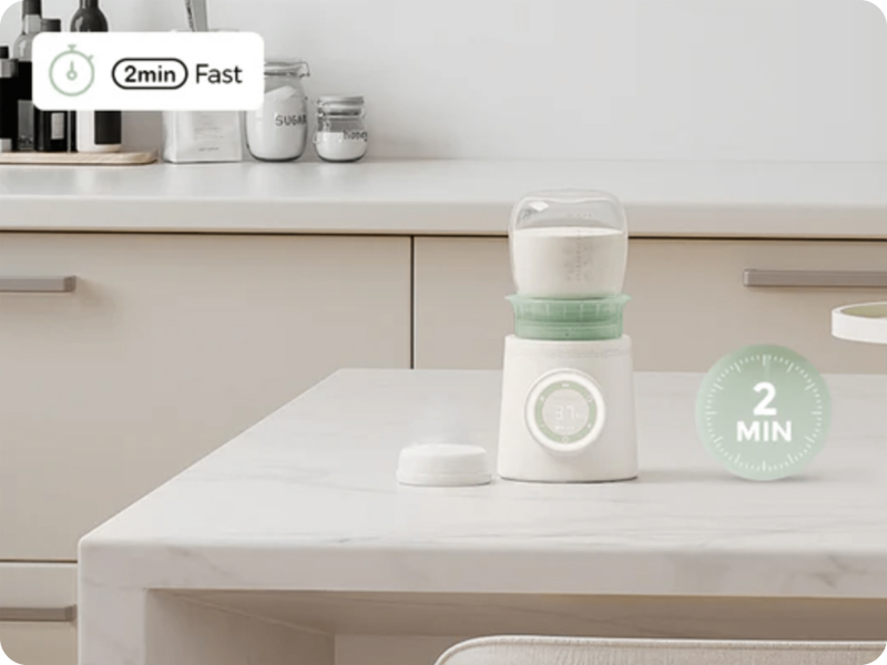 Przenośny podgrzewacz do butelek ma funkcję szybkiego podgrzewania, która podgrzewa 4 oz/120 ml mleka do 98 ℉ w zaledwie 2 minuty. Przenośny podgrzewacz do butelek dla dzieci jest wykonany z materiałów przeznaczonych do kontaktu z żywnością, aby zapewnić bezpieczeństwo dziecka i zachowuje składniki odżywcze w mleku bez zapachu i szkodliwych substancji. Przenośny podgrzewacz do butelek dla dzieci Momcozy posiada ceramiczną płytę grzewczą, która zapewnia szybkie i równomierne podgrzewanie mleka, a czujnik kontaktowy ze stali nierdzewnej i podwójny silikonowy pierścień zapobiegają wyciekom i zapewniają wyświetlacz LCD temperatury w czasie rzeczywistym bez obawy o przegrzanie.
