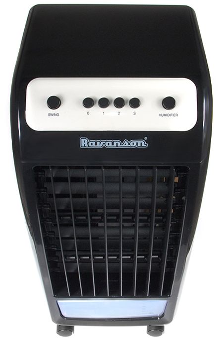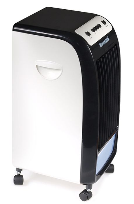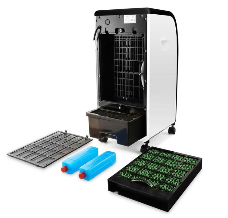 Powietrze zasysane z pomieszczenia przechodząc przez ekran nawilżony zimną wodą (można również zastosować pojemnik na lód), wydostaje się na zewnątrz urządzenia chłodniejsze i nawilżone.