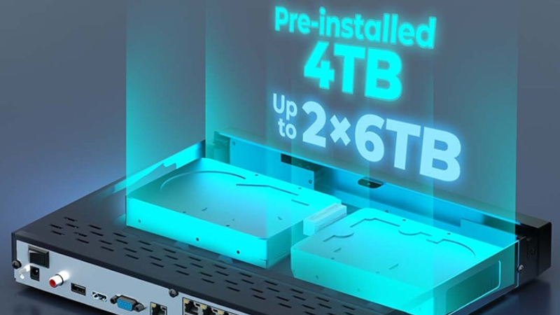 Reolink NVS16 gwarantuje obszerną konfigurację pamięci masowej za sprawą dwóch miejsc SATA, pozwalając tym samym na dodanie dwóch dysków twardych o pojemności aż do 6 TB. Wraz ze standardowym wyposażeniem obejmującym dysk o pojemności 4 TB, możesz cieszyć się dużą ilością miejsca na zapis wideo. Dodatkowo za sprawą maksymalnej pojemności do 12 TB możesz przez długi czas przechowywać swoje dane, eliminując konieczność ciągłego przenoszenia lub usuwania.