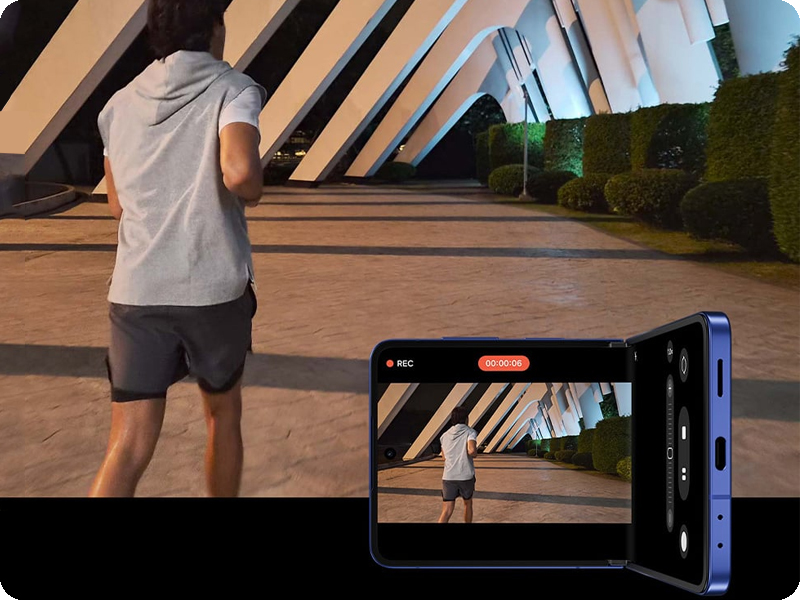 Na tylnej obudowie znalazły się dwa obiektywy o rozdzielczościach 50 MP (główny) i 12 MP (ultraszeroki). Przednia kamera w ekranie wewnętrznym ma 10 MP i pozwala na wyraźne selfie oraz wideorozmowy. Smartfon wspiera nagrywanie wideo w rozdzielczości 4K przy 60 fps, dzięki czemu filmy są płynne i mają wysoką jakość. Opcje takie jak OIS, autofocus oraz zoom pozwalają na kreatywne kadry i stabilne ujęcia. Dodatkowo Galaxy AI wspomaga edycję zdjęć i filmów bezpośrednio na urządzeniu.