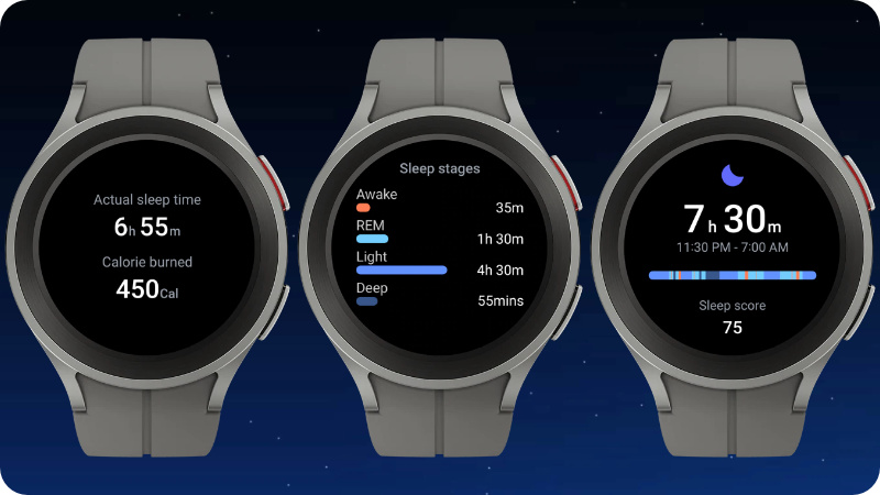 Poznaj szczegółowe dane dotyczące parametrów Twojego snu dzięki udoskonalonym rozwiązaniom dostępnym w Galaxy Watch5 Pro. Wyrabiaj zdrowe nawyki, aby wypoczywać jeszcze lepiej. Planuj porę snu, wykrywaj chrapanie i odkryj fazy swojego snu. Te reprezentowane są za pomocą 8 symboli zwierząt odpowiadających różnym typom snu. Im lepiej wypoczywasz w nocy, tym wspanialszy jest następny dzień.