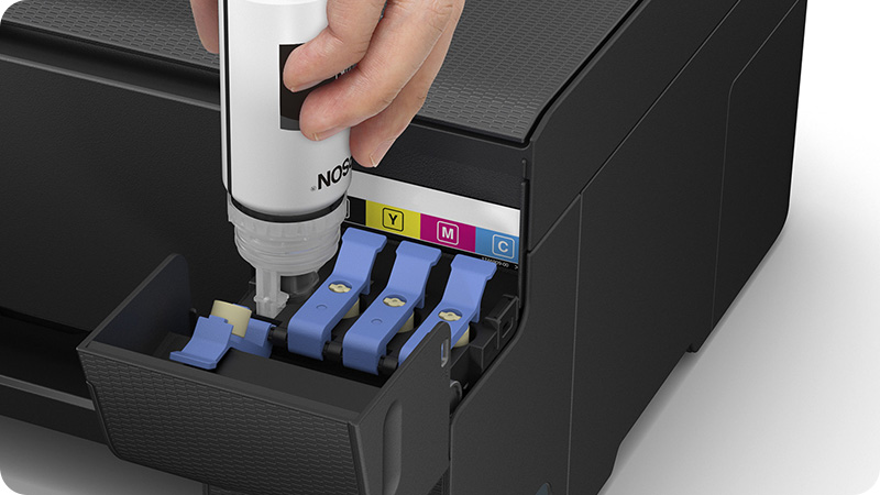 Umieszczenie pojemnika na atrament z przodu drukarki umożliwia nie tylko łatwą kontrole poziomu i wymianę atramentu ale też zapewnia małe i kompaktowe rozmiary, dzięki którym drukarka zajmuje mało miejsca. Dodatkowo drukarka epson zawiera udoskonalony system napełniania który zapobiega ryzyku rozlania atramentu lub powstania zanieczyszczeń. Z kolei nowe butelki zostały wyposażone w system zapewniający napełnienie tylko właściwego pojemnika.
