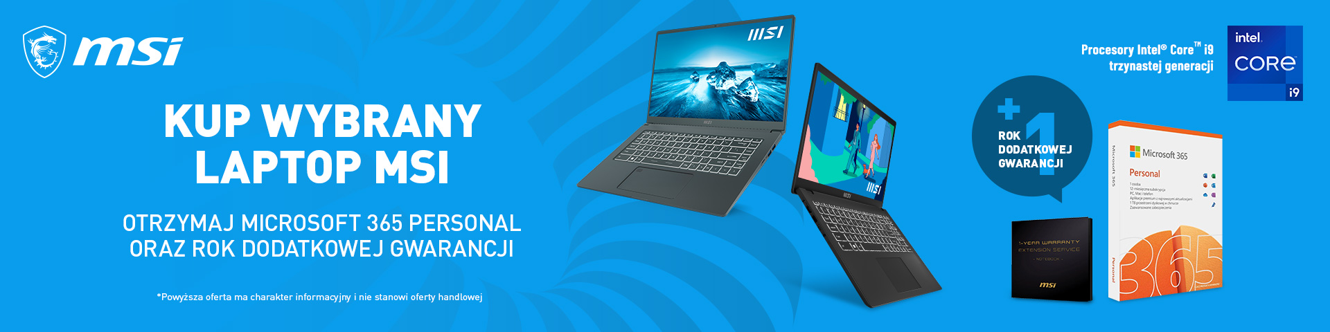 Kup wybrany laptop MSI i otrzymaj Microsoft 365 Personal oraz rok dodatkowej gwarancji.