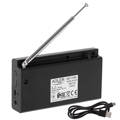Radio Adler AD 1198 łączy w sobie tradycję z nowoczesnością, oferując doskonałą jakość dźwięku, bezprzewodową łączność i łatwość obsługi. Dzięki kompaktowym wymiarom, mocnemu głośnikowi i wielu funkcjom dostosowującym, jest idealnym wyborem dla każdego, kto szuka uniwersalnego i przenośnego urządzenia audio. Ciesz się swoją ulubioną muzyką i stacjami radiowymi, gdziekolwiek jesteś, dzięki radiu przenośnemu Adler AD 1198.
