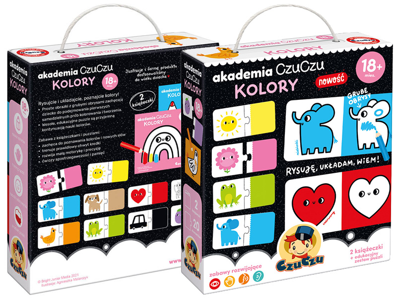 Wyjątkowy zestaw edukacyjny dla dzieci, które ukończyły 18 miesiąc życia, składa się z dwóch książeczek do kolorowania oraz 10 dwuelementowych układanek! Ilustracje w książeczkach posiadają grube kontury oraz duże pola, aby ułatwić dzieciom pierwsze próby trzymania kredki i tworzenia, a także kolorowania. Natomiast puzzle są naturalną kontynuacją zabawy, a przy tym świetnie ćwiczy rączki, spostrzegawczość oraz logiczne myślenie. Zestaw Akademia CzuCzu Kolory - to idealny sposób na początek rozwoju Twojego dziecka!