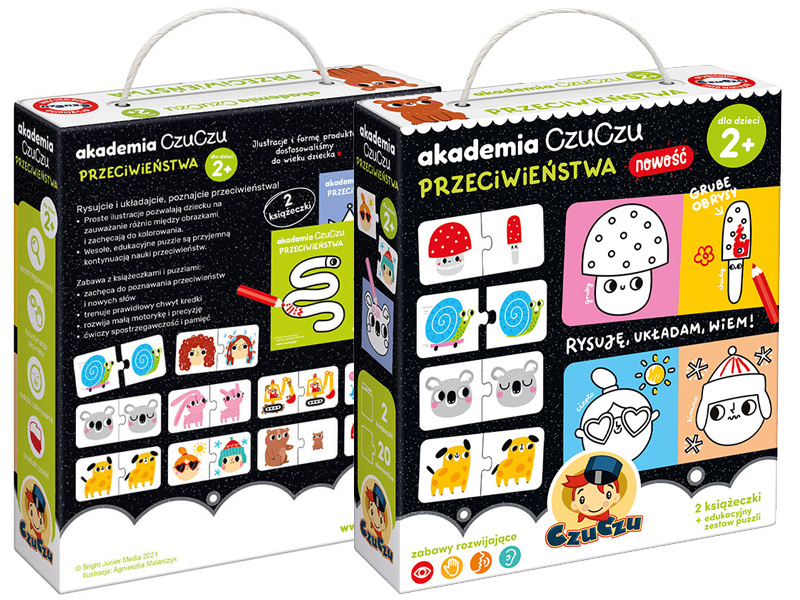 Wyjątkowy zestaw edukacyjny dla dzieci, które ukończyły 2 rok życia, składa się z dwóch książeczek do kolorowania oraz 10 dwuelementowych puzzli! Ilustracje w książeczkach posiadają grube kontury oraz duże pola, aby dzieci miały duże pole do wyrażenia swojej kreatywności. Natomiast puzzle są naturalną kontynuacją zabawy, a przy tym świetnie doskonali sprawność dłoni, spostrzegawczość oraz logiczne myślenie. Zestaw Akademia CzuCzu Przeciwieństwa - to idealny sposób na kontynuację rozwoju Twojego dziecka!