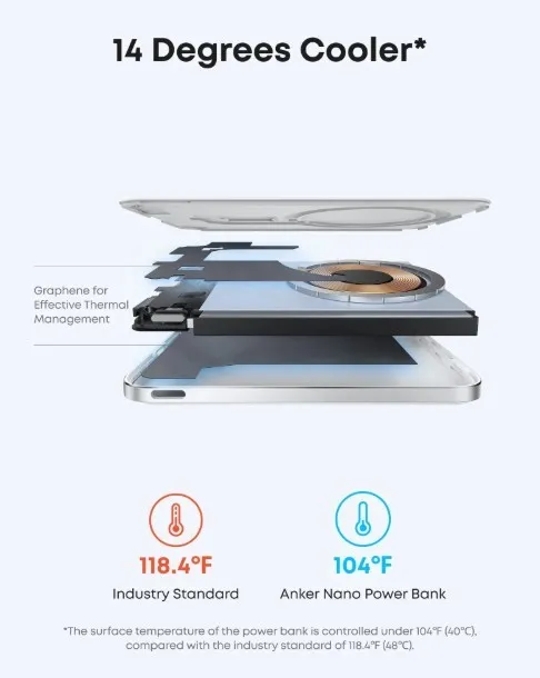 - 104°F dla bezpieczniejszej obsługi: Dzięki wyjątkowym korzyściom chłodzenia grafenu, podwójnym chipom NTC i inteligentnym regulacjom ładowania, ten power bank pozostaje poniżej 104°F, 14 stopni chłodniej niż standard branżowy, co zapewnialepszą i bardziej niezawodną wydajność ładowania.