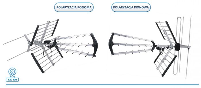 Antena posiada dwa dipole w tym jeden zmienny dzięki czemu jest przystosowana do odbioru w polaryzacji poziomej lub pionowej, zasięg odbioru anteny wynosi do 120 km.
