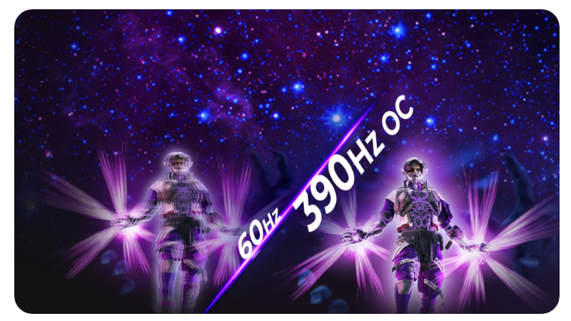 Graj jak profesjonalni gracze z najwyższą wydajnością przy częstotliwości odświeżania aż 390 Hz i płynnym obrazie, na którym wszystkie ruchy wyglądaj naturalnie. Dzięki takiej technologii entuzjaści mogą cieszyć się bardziej wciągającymi i responsywnymi wrażeniami z gry, przesuwając granice tego, co jest możliwe w dynamicznych scenariuszach gier.
