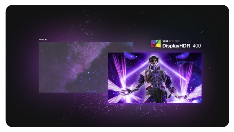 Nawet najniższy poziom funkcji High Dynamic Range (HDR) oferuje znaczną poprawę obrazu na monitorze. Szczytowa wartość luminancji wynosząca 400 cd/m² pozwala ekranowi na poprawę jakości obrazu dzięki uzyskaniu szerszego spektrum barw i większemu zróżnicowaniu kontrastu. Certyfikat VESA gwarantuje bogactwo szczegółów i realistyczne wyświetlanie gier oraz filmów.