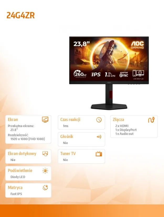 AOC Monitor 23.8 cala 24G4ZR Fast IPS 240Hz HDMIx2 DP Pivot