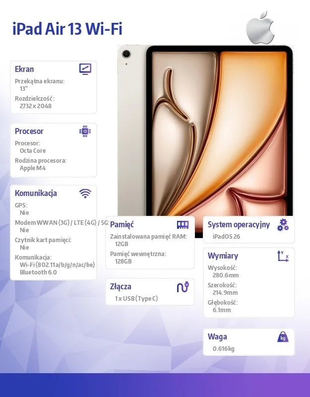 Apple iPad Air 13 Wi-Fi 128GB Księżycowa poświata