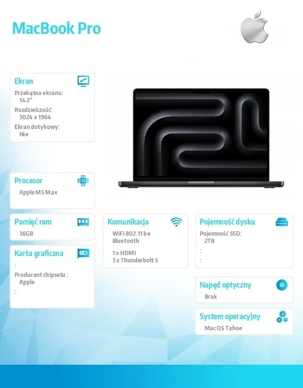 Apple MacBook Pro 14.2 cala: M5 Max 18/32, 36GB, 2TB SSD, bez zasilacza - Gwiezdna czerń