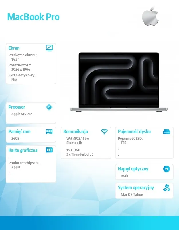 Apple MacBook Pro 14.2 cala: M5 Pro 15/16, 24GB, 1TB SSD, bez zasilacza - Srebrny