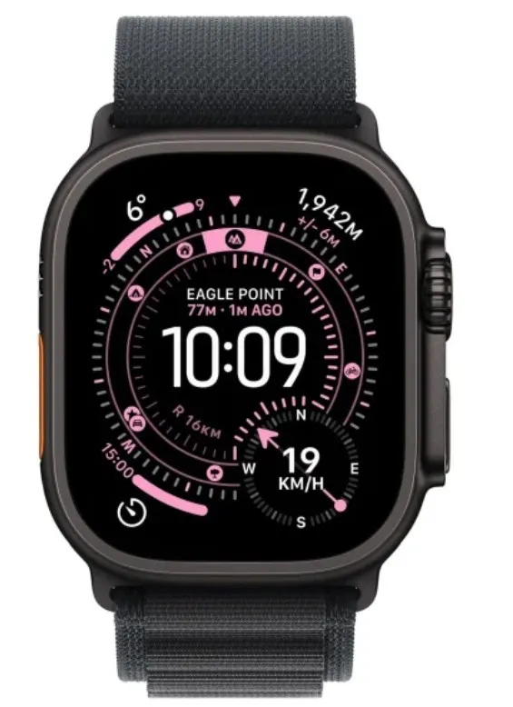 - Apple Watch Ultra 3 z kopertą z tytanu w kolorze naturalnym, widać mapy offline i kolejne wskazówki, zegarek ma opaskę Alpine w kolorze terakoty
