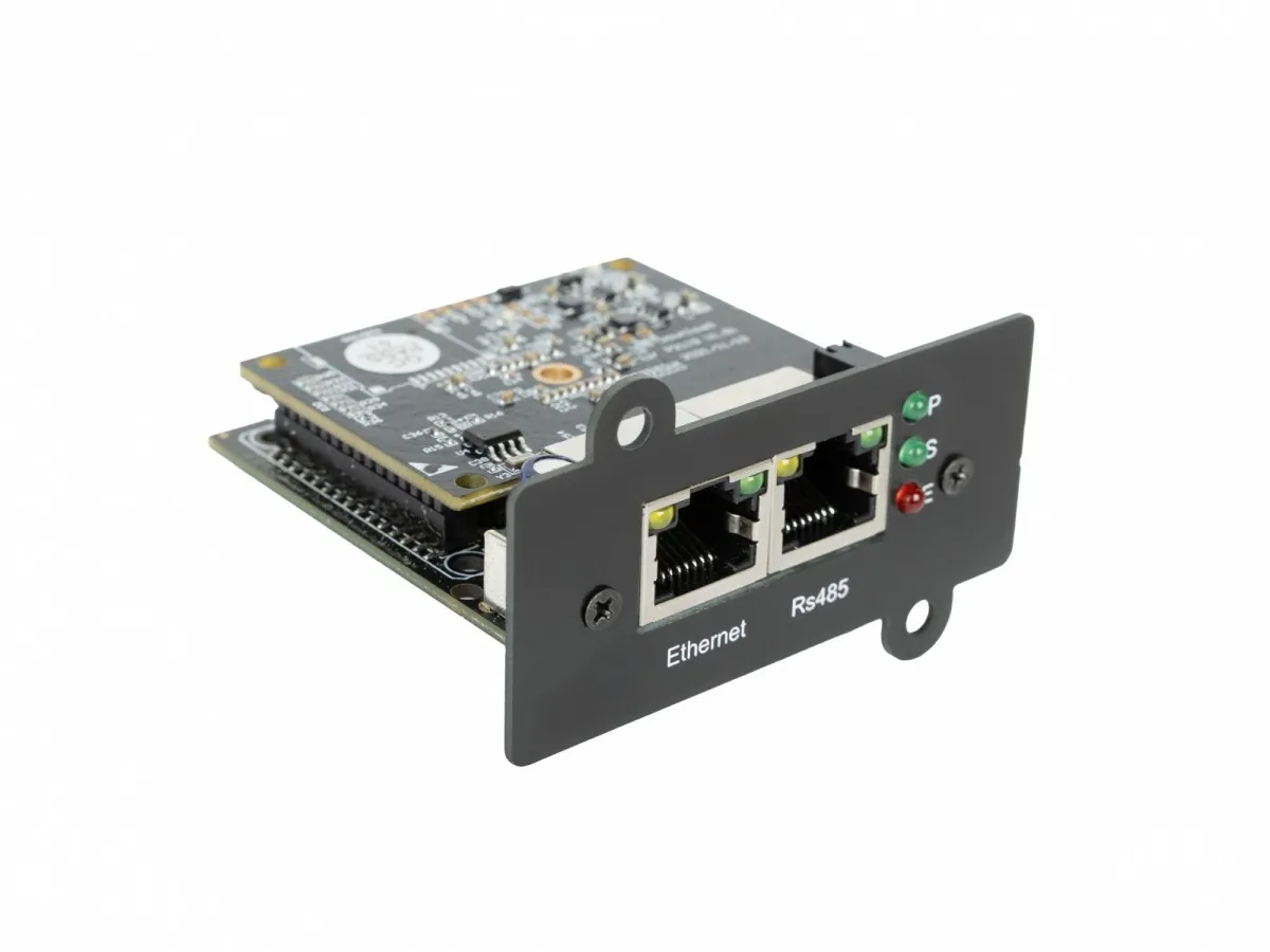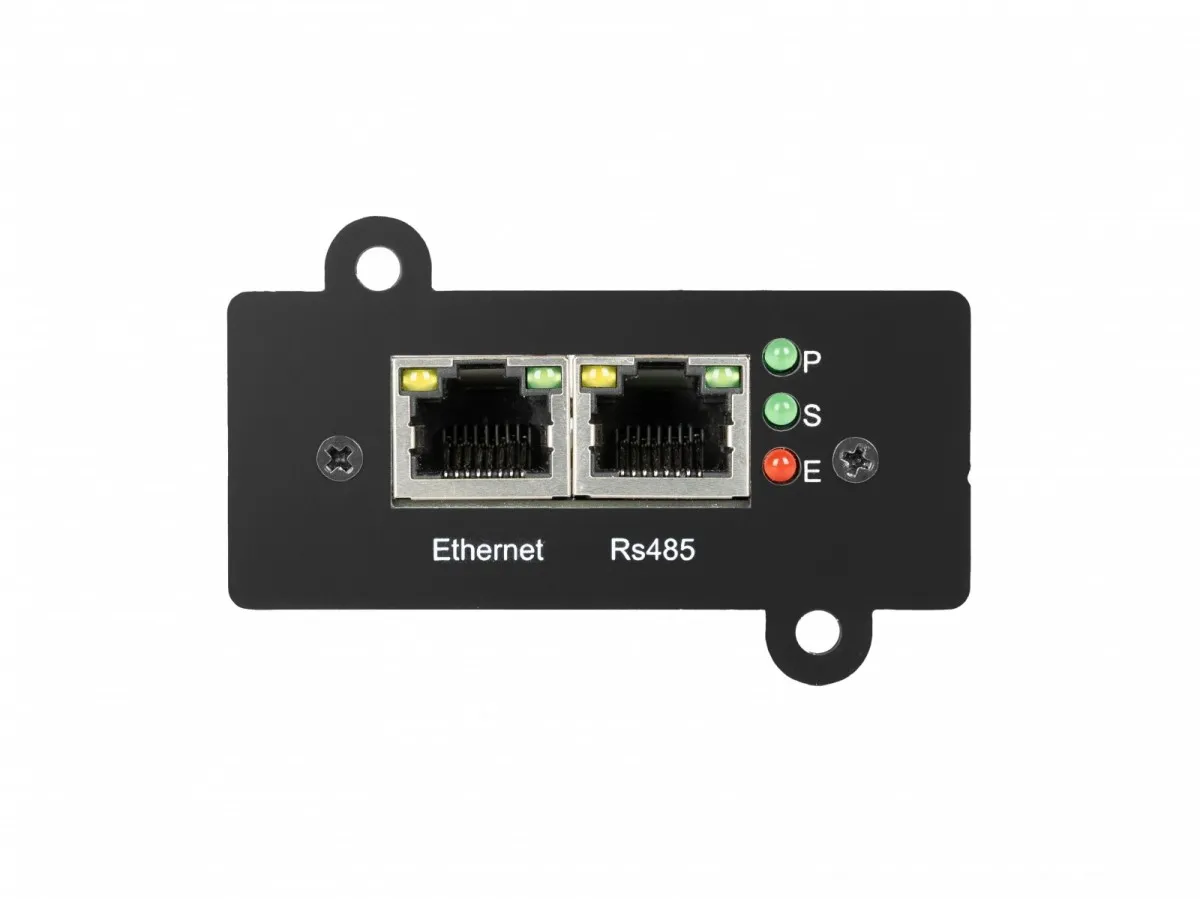 - Modbus RTU (485): karta może pracować jako Poll (master), gdzie w tym trybie pozwala odpytywać do 8 zewnętrznych czujników/urządzeń, lub jako Slave, udostępniając parametry UPS np. sterownikom PLC. Tryby są przełączalne i wzajemnie się wykluczają.