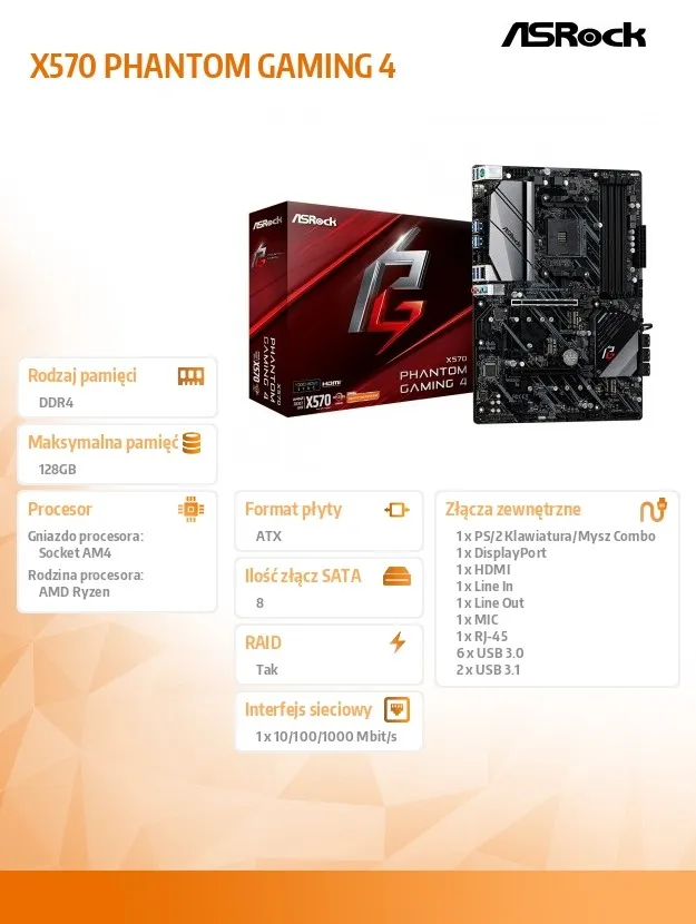 Komputery i podzespołyPodzespołyPłyty główneASRock Płyta główna X570 Phantom Gaming 4 AM4 4DDR4 HDMI/DP M.2 ATX