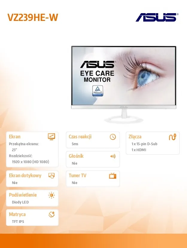 ASUS VZ239HE-W Eye Care Monitor 23-calowy, Full HD, IPS, ultrawąski, bezramkowy, brak migotania, Low Blue Light Technology.