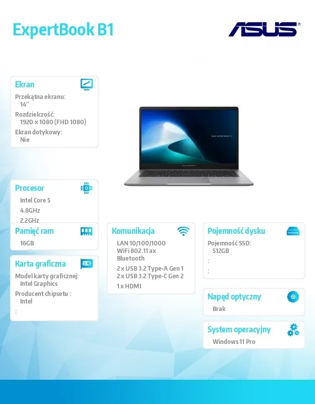 Laptopy i TabletyLaptopyAsus Notebook ExpertBook B1 P1403CVA-S61695X Core 5 210H 16GB/512GB/W11 Pro