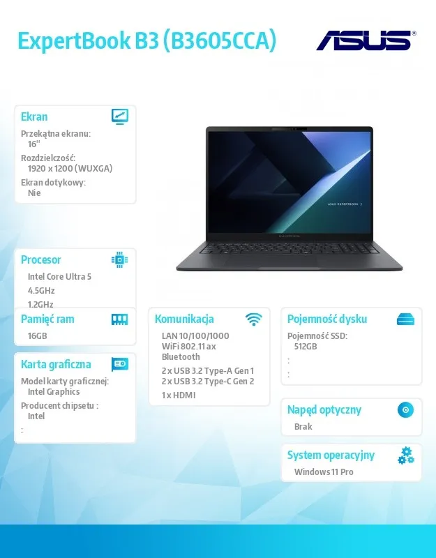 ASUS ExpertBook serii B3 AI PC oferuje szerokie możliwości personalizacji, aby sprostać codziennym potrzebom biznesowym. Wyposażony w procesor Intel Core Ultra 5 z Intel vPro, Intel AI Boost NPU i grafiką Intel Arc, ten komputer AI zapewnia solidną wydajność, aby płynnie wykonywać szeroki zakres zadań. ASUS ExpertBook B3 oferuje narzędzia AI, takie jak ASUS AI ExpertMeet, Microsoft Copilot i technologię redukcji szumów AI, zapewniając niezrównaną produktywność. Dzięki wytrzymałości, pełnej gamie portów I/O, ultraszybkiemu Wi-Fi 6E i zaawansowanym funkcjom bezpieczeństwa, ten lekki komputer AI zapewnia elastyczność i wydajność w podróży. Ponadto, dzięki długiej żywotności baterii, wyjątkowej jakości obrazu i dźwięku oraz przyjaznej dla środowiska konstrukcji, seria ASUS ExpertBook B3 wspiera zrównoważony, usprawniony przepływ pracy - zapewniając produktywność w każdym miejscu.