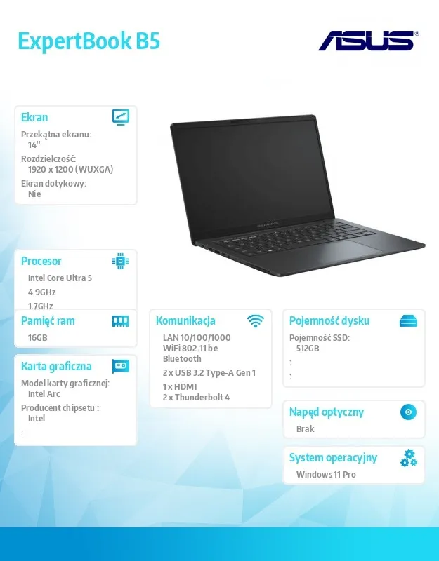 ASUS ExpertBook B5 to lekki, wzbogacony o sztuczną inteligencję komputer, który łączy najnowszy procesor Intel Core Ultra oraz wbudowaną grafiką Intel Arc, otwierając nową erę produktywności. To niezawodny partner biznesowy, oferujący doskonałą wydajność w podróży, zabezpieczenia klasy korporacyjnej oraz wszechstronne możliwości personalizacji dla profesjonalistów myślących strategicznie -dodatkowo wspierany przez AI, aby ułatwić pracę w nowoczesnym środowisku biznesowym.