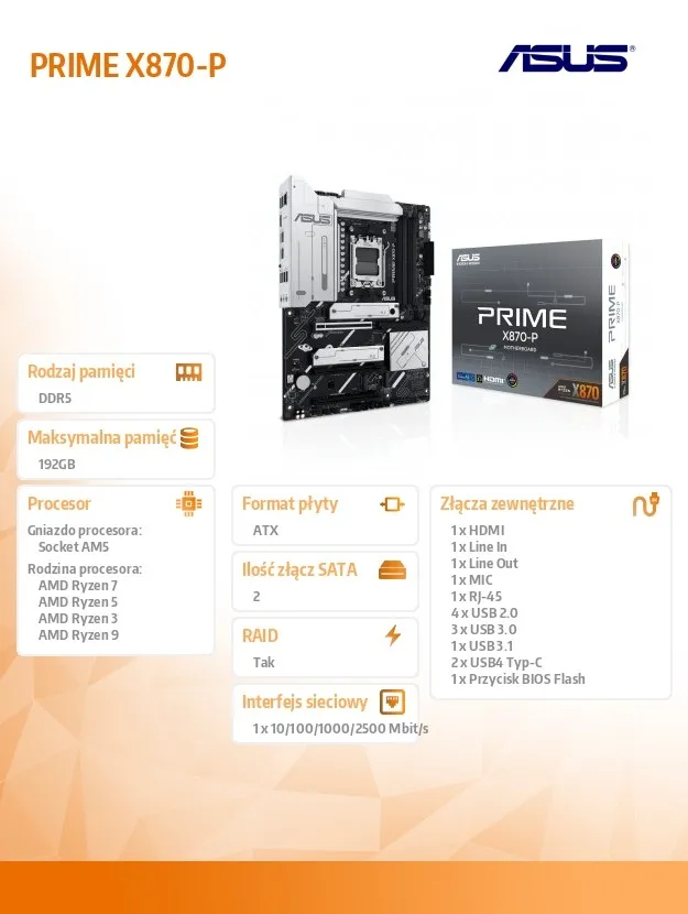 Asus Płyta główna PRIME X870-P AM5 4DDR5 HDMI/USB-C ATX