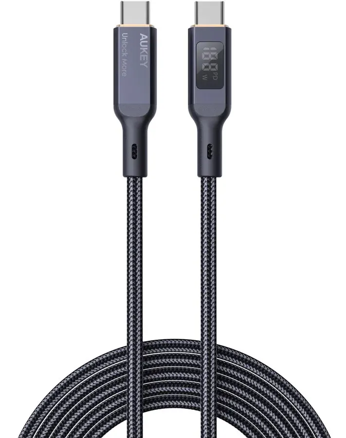 Przejmij pełną kontrolę nad ładowaniem urządzeń kabel USB-C z wyświetlaczem LED firmy Aukey, wyświetla informację o aktualnej mocy ładowania. Możesz go użyć zarówno do ładowania laptopa, jak i telefonu, konsolowych joysticków oraz wszelkich innych urządzeń ze złączem USB-C.