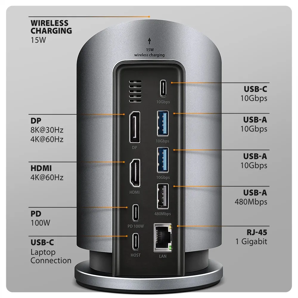 Wieloportowy hub USB-C 10Gbps AXAGON HMC-WL9 WIRELESS CHARGING 9in1 rozszerza laptop, komputer lub telefon o dwa wyjścia wideo, złącze LAN, porty USB oraz bezprzewodową ładowarkę. Laptop do huba podłączasz za pomocą kabla USB-C o długości 60 cm. Od razu masz przyłącze dla dwóch monitorów 4K, trzech urządzeń USB i złącze RJ-45 do sieci Gigabit Ethernet. Możesz także zasilić laptopa dzięki technologii Power Delivery. Dzięki kompatybilności z interfejsem Thunderbolt 3/4/5 stację dokującą 9w1 możesz używać również z notebookami takimi jak Apple MacBook Air lub MacBook Pro.