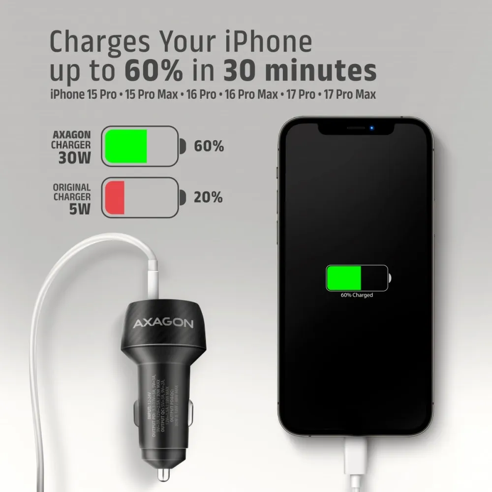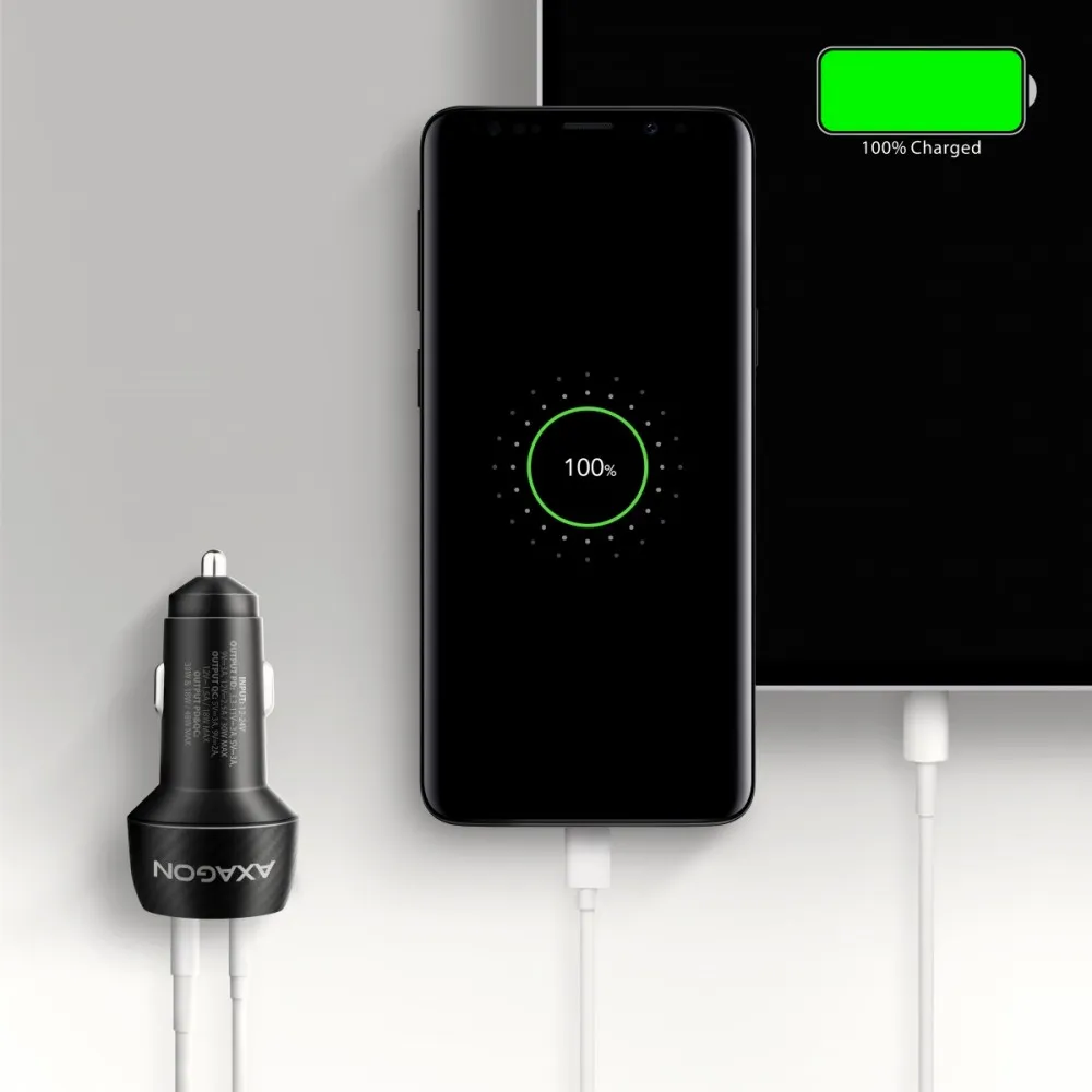 Uniwersalna ładowarka samochodowa AXAGON PWC-PQ48 umożliwia szybkie ładowanie nawet dwóch urządzeń mobilnych jednocześnie, zapewniając wygodę w podróży. Dzięki całkowitej mocy 48 W ładowarka może ładować telefony i tablety z najwyższą możliwą prędkością. Adapter oferuje standardowe złącze USB-A, ale także dwustronne złącze USB-C.