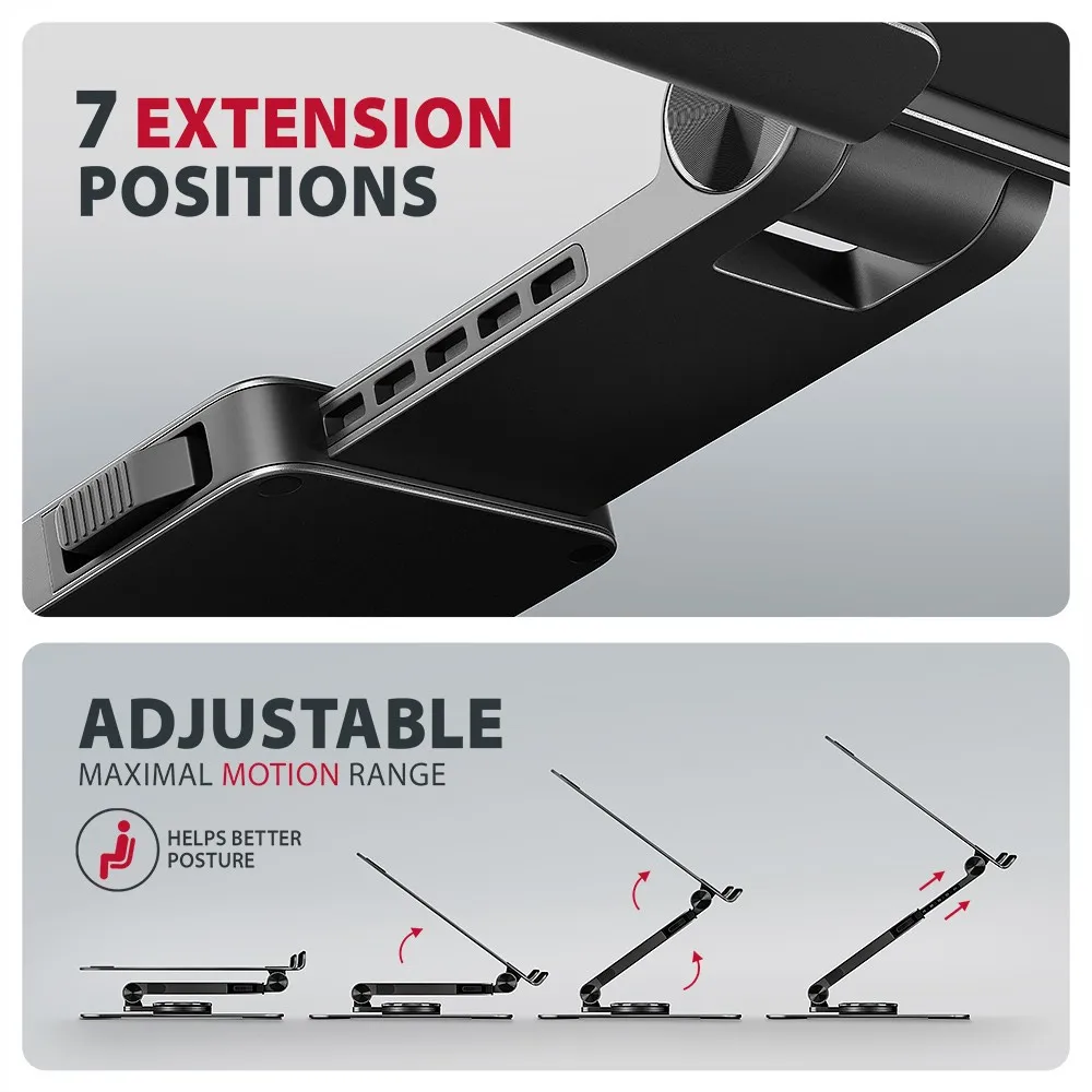 Unikalną cechą jest wysuwane ramię z blokadą przed zwolnieniem, które umożliwia wydłużenie go o maksymalnie 6 cm dzięki siedmiu regulowanym pozycjom. Ułatwia to dostosowanie laptopa do optymalnej wysokości i odległości od oczu w zależności od potrzeb. Dzięki pomysłowemu rozwiązaniu z podwójnym zawiasem można płynnie regulować wysokość ekranu, tak aby był on na równi z monitorem zewnętrznym. Daje to dodatkową przestrzeń roboczą odpowiedniej wysokości oczu i znacznie poprawia ergonomię oraz komfort i zwiększa produktywność.
