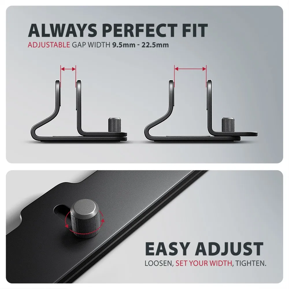 Zaletą jest regulowany rozstaw podstawki od 9.5 mm do 25.5 mm, dzięki czemu można w niej łatwo umieścić większość laptopów. Ustawioną szerokość niezawodnie utrzymuje frezowana śruba regulacyjna, która solidnie blokuje wybraną pozycję.