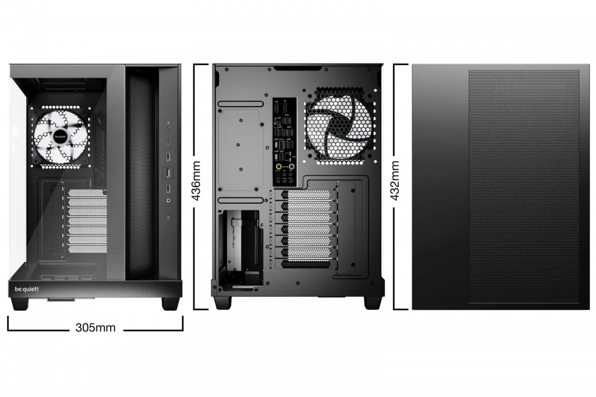 Tacka płyty głównej w pełni obsługuje złącza z tyłu, takie jak Asus BTF (Back to Future), MSI Project Zero i Gigabyte Project Stealth, zapewniając prawdziwy widok bez przewodów. Aby umożliwić obsługę złączy z tyłu bez rezygnacji z gniazda na dysk, wystarczy zamienić miejscami zasilacz i wspornik dysku!