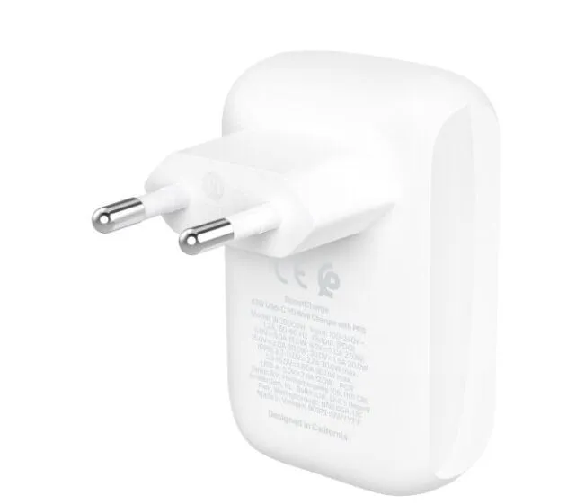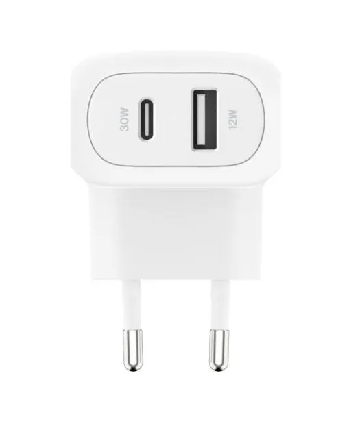 Nasza podwójna ładowarka sieciowa o mocy 42 W umożliwia szybkie ładowanie smartfona iPhone lub Samsung oraz ładowanie innego urządzenia w tym samym czasie. Dostępne gniazda to USB-C 30 W oraz USB-A 12 W. Ładowarka ma certyfikat USB-C PD 3.1 i szybko ładuje telefony iPhone od 0 do 50% w 21 minut oraz telefony Samsung od 0 do 50% w 26 minut.