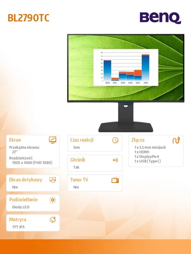 Osiągnij żywe kolory i niezawodną ostrość z każdego kąta dzięki panelowi IPS monitora BL2790TC i 99% pokryciu przestrzeni barw sRGB. Czterostronna, ultracienka ramka pomaga utrzymać skupienie i komfort podczas pracy nad dokumentami i wielozadaniowością przez cały dzień.