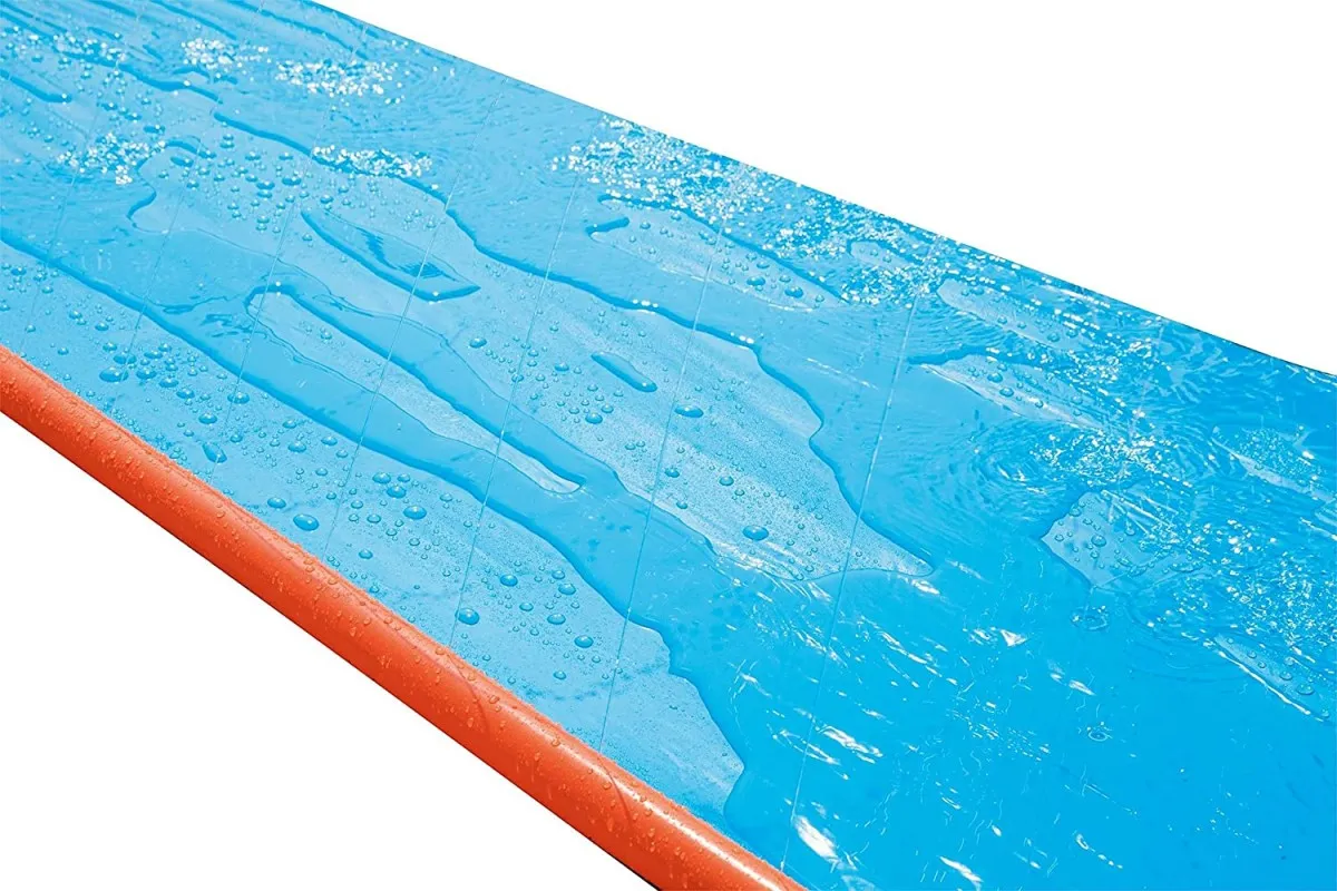 Ślizg wodny pojedynczy H2OGO! o długości 488 cm marki Bestway to fantastyczna propozycja na gorące, letnie dni, idealna do ogrodu. Przeznaczony dla dzieci od 3. roku życia, zapewnia długą i bezpieczną zabawę na świeżym powietrzu. Tor zjazdowy wyposażony jest w system spryskiwaczy SplashBoost™, który stale nawilża powierzchnię ślizgu, zapewniając doskonały poślizg oraz efektowną kaskadę wodną podczas jazdy. Na końcu toru znajduje się nadmuchiwany basenik, który amortyzuje zjazd i kończy przejazd efektownym rozpryskiem wody. Ślizgawka wykonana jest z wytrzymałego PVC o grubości 0,20 mm, odpornego na uszkodzenia mechaniczne i intensywną eksploatację. Montaż jest niezwykle prosty – wystarczy rozłożyć ją na trawie, podłączyć wąż ogrodowy i przymocować do ziemi za pomocą dołączonych kołków. W zestawie znajduje się również łatka naprawcza. Produkt cieszy się dużym uznaniem wśród rodziców i dzieci dzięki trwałości, funkcjonalności i gwarancji doskonałej zabawy. To świetny sposób na aktywne spędzenie czasu na świeżym powietrzu i ochłodę podczas upałów.