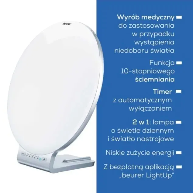 Światło dzienne stymuluje nasz mózg za pomocą poprawiającego nastrój neuroprzekaźnika-serotoniny. Aby zapewnić wystarczającą ilość światła każdego dnia, lampa TL 100 firmy Beurer wytwarza światło o natężeniu 10 000 luksów (w odległości ok. 10 cm). Każdego ranka możesz sobie pozwolić na 30-minutowy seans z lampą do światłoterapii, aby aktywniej rozpocząć dzień.